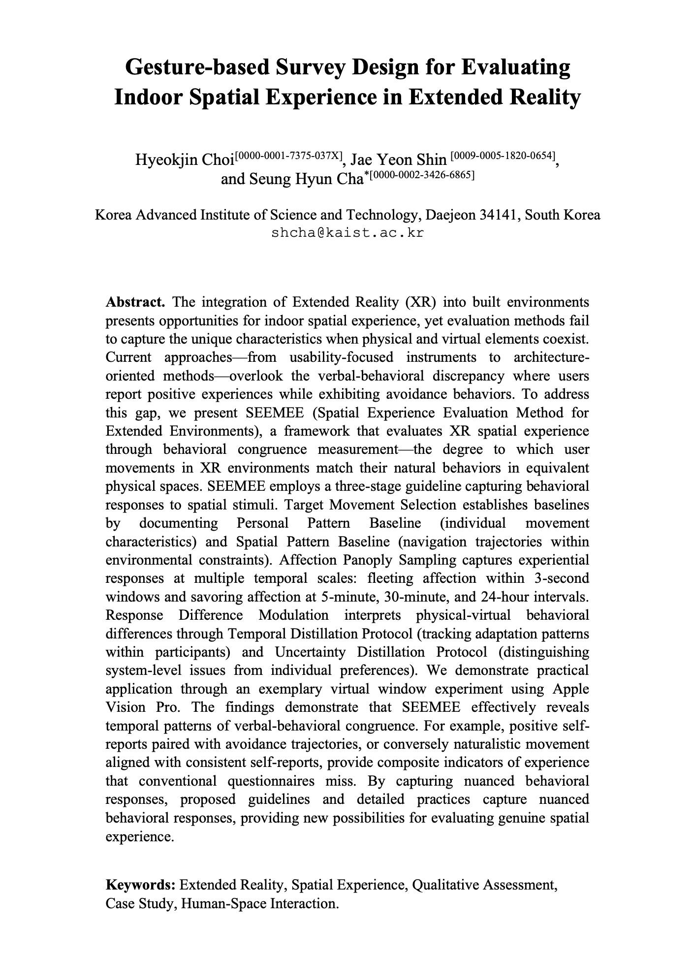 Choi, H., Shin, J., and Cha, S., "Gesture-based Survey Design for Evaluating Indoor Spatial Experience in Extended Reality", The International Conference of Smart and Sustainable Built Environment (SASBE), Lille, France, 3-5 November, 2025.